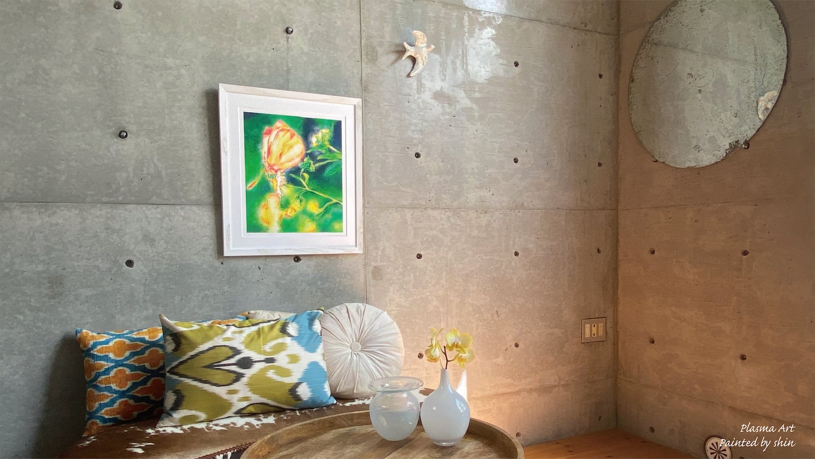 zoomを利用するときにバーチャル背景の画像としてご使用いただけるデータです。 PLASMA ART『光源』の絵画を飾ったお部屋です。